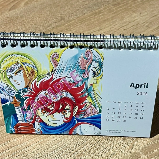 Produit : Calendrier à spirale 2026 de bureau avec son supprt carton. Illustrations de Keiichi Ichikawa (Saint Seiya, One Piece) et de Spaceweaver
